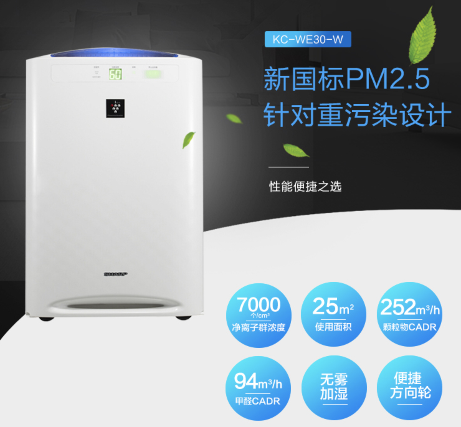 夏普 KC-WE30-W采用的是簡潔大方的外觀設計,產品尺寸為393mm*270mm*603mm,凈離子群結合濾網的凈化方式,能夠有效去除甲醛,PM2.5以及其他有害細微顆粒物。這款產品具備特有的凈離子群空間凈化技術,對霉菌和病毒的殺滅有很大幫助,最后離子會形成水返回到空氣中。