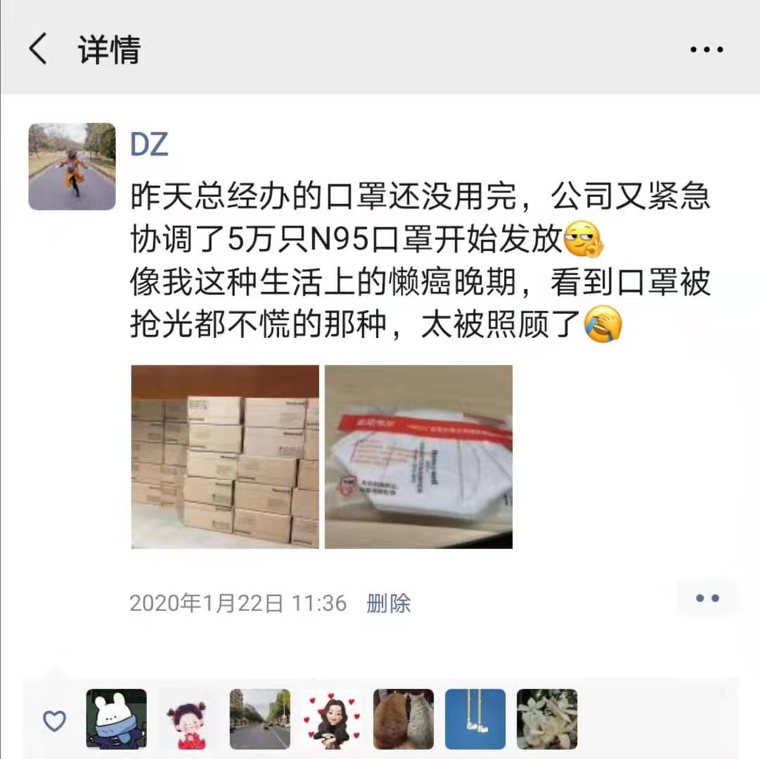 春節(jié)放假前夕,疫情形勢陡然嚴峻。在蘇寧南京總部工作的小丁清楚地記得,1月2 2 日那天,她在上班的路上,看到戴口罩的人多了起來,還和小伙伴念叨著也要趕緊買些。結果,當天上午,部門就給每人發(fā)了一個全新的N9 5 口罩,讓她倍感驚喜和暖心。原來,蘇寧總部緊急調(diào)集了5萬個口罩發(fā)到員工手中,各大區(qū)也紛紛緊急調(diào)貨給員工發(fā)放。自稱“懶癌晚期”、平時連朋友圈都很少發(fā)的她,忍不住發(fā)圈為公司點贊。