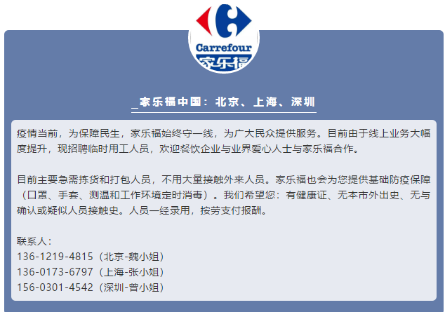 此外,家樂福還向全社會發(fā)出召集,以北京、上海、深圳為重點城市,希望社會暫時性歇業(yè)人員能夠前來上崗,主要工作職責(zé)為線上業(yè)務(wù)的揀貨、打包,不用大量接觸外來人員。家樂福將提供快速上崗培訓(xùn),包括個人安全衛(wèi)生和防護(hù)、顧客服務(wù)和崗位技能培訓(xùn),以及基礎(chǔ)防疫保障。