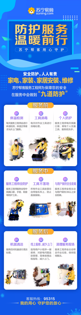 據(jù)悉,蘇寧家電“九道防護(hù)”措施涵蓋服務(wù)的前、中、后期全程。服務(wù)前,蘇寧服務(wù)工程師需進(jìn)行體溫檢測,衣物工具車輛消毒,同時佩戴口罩;服務(wù)過程中,需佩戴口罩、手套、鞋套等全套防護(hù)工具,并主動與用戶保持2米的安全距離,避免直接接觸;服務(wù)完成后,對機器進(jìn)行清潔處理,同時指導(dǎo)用戶關(guān)注報修和故障求助,帶走作業(yè)垃圾。