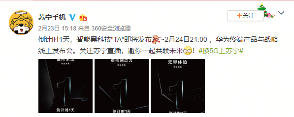 深圳新聞網(wǎng)2020年2月24日訊 2月24日21時,華為新品“云發(fā)布會”將在蘇寧直播舉行,余承東等華為高層將亮相,為大家?guī)矶嗫钚缕?。從蘇寧手機官方微博發(fā)布內(nèi)容可以看到,此次華為新品發(fā)布會將推出全新的折疊屏手機 Mate Xs以及新一代平板和筆記本電腦。