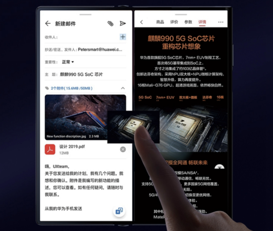 Mate Xs采用8英寸顯示屏,分辨率為2480×2200,折疊時,屏幕尺寸為6.6英寸,分辨率為2480×1440。展開狀態(tài)下,華為Mate Xs充分發(fā)揮突破視野的視覺空間優(yōu)勢,在瀏覽視頻、開啟閱讀、使用導航以及游戲影音時,將獲得前所未有的視覺極限與沉浸體驗。此外,通過智慧分屏模式,可以同時顯示、運行多個應用程序,多窗口交互提升應用體驗及操作效率。這種智慧分屏模式提供平行視界、跨屏拖拽、懸浮窗、分屏快捷欄等高頻使用場景智慧生態(tài)操作。