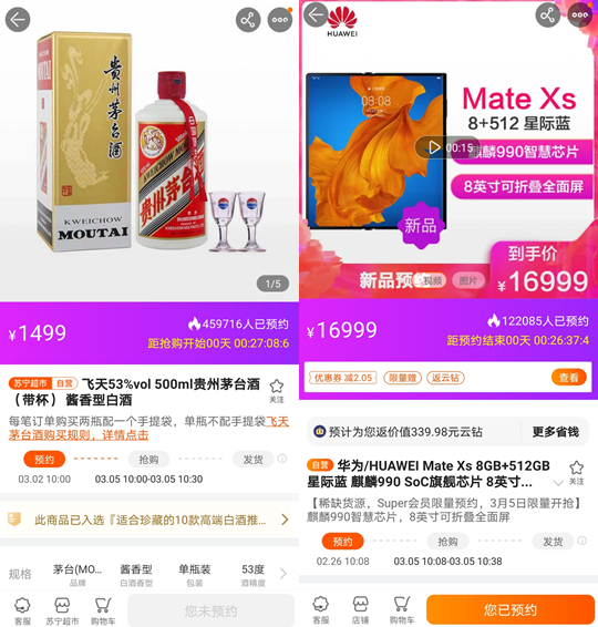 深圳新聞網(wǎng)2020年3月5日訊 今日10點(diǎn),飛天茅臺(tái)再次在蘇寧易購(gòu)開(kāi)售,售價(jià)1499元,而就在茅臺(tái)開(kāi)售后10點(diǎn)08分,華為最新折疊屏手機(jī)Mate Xs同樣在蘇寧開(kāi)售,售價(jià)更是達(dá)到16999元。