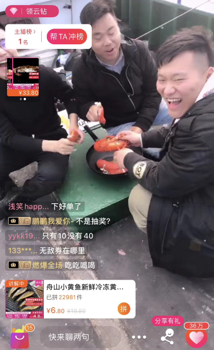 一旁直播的尹鴻狀態(tài)正好,從剛開播到現(xiàn)在,直播間的人數(shù)嗖嗖往上竄,不一會(huì)便聚集了十幾萬(wàn)圍觀群眾。搖晃的直播鏡頭,更具真實(shí)感,似乎把觀眾帶到了船上一般。尹鴻馬不停蹄在船上踱步,給觀眾介紹各種海鮮小知識(shí),并大力吆喝起這次直播主打的兩款產(chǎn)品:深海小黃魚和舟山帶魚。“我們蘇寧拼購(gòu)的海產(chǎn)品都是從張老大這樣漁民手中收來(lái)的,下單直發(fā),眼見為實(shí)。”
