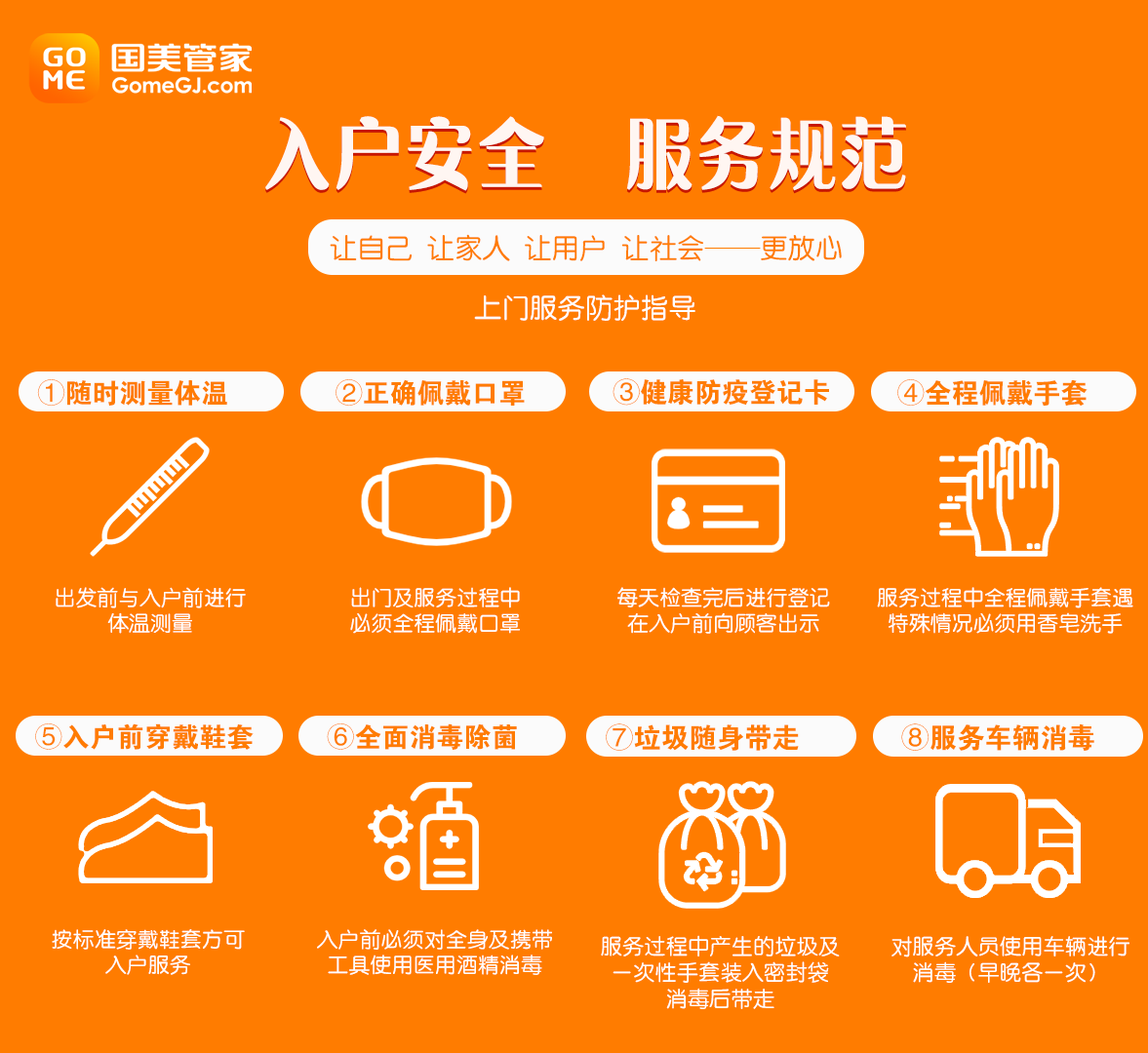 第二天上午,國美管家的售后服務工程師唐勝(化名)在小區(qū)測溫登記后按響了李女士家的門鈴,向李女士出示了“健康防疫登記卡”,拿出體溫槍對準手腕、額頭分別測溫,均顯示正常。在門外唐勝還更換了新的口罩、佩戴防護手套、穿戴好鞋套,在自身全面消毒后才進入李女士家中。