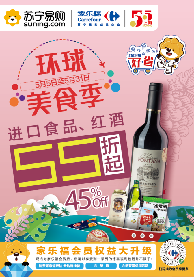 此外,家樂福方面還宣布將加大投入,全面支持上?!拔逦遒徫锕?jié),全城打折季”。5月5日至31日,上海地區(qū)家樂福門店將開啟“環(huán)球美食季”,精選來自法國、意大利、英國、西班牙、美國、加拿大、日本、韓國、馬來西亞等39個國家的350個品牌旗下共計3700多種進(jìn)口食品,與上海消費者共襄盛舉。美食自然少不了美酒相伴,來自法國、意大利、西班牙、阿根廷、智利、澳洲等國家的70多個品牌旗下共計200多種進(jìn)口葡萄酒,也將悉數(shù)亮相全市家樂福門店?;顒悠陂g,進(jìn)口食品低至5.5折起,進(jìn)口紅酒買一送一。進(jìn)博會“同款”法國奧格斯汀系列葡萄酒也將首次參與促銷,葡萄酒愛好者不容錯過。