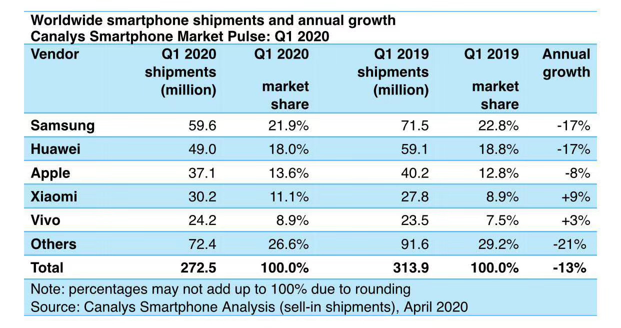 另一家國際權(quán)威機(jī)構(gòu)Canalys也在今天發(fā)布了今年一季度全球智能手機(jī)的出貨量報(bào)告,前五大手機(jī)廠商的排名和IDC的報(bào)告一樣。該報(bào)告顯示,今年一季度全球智能手機(jī)出貨量受新冠疫情影響下降13%,而vivo在重回前五的同時(shí),全球出貨量逆勢同比增長3%。