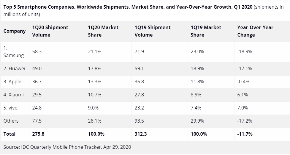 見圳客戶端·深圳新聞網(wǎng)2020年5月6日訊 國際權(quán)威機(jī)構(gòu)IDC最新報(bào)告顯示,全球智能手機(jī)出貨量在2020年第一季度同比下降11.7%。其中,三星、華為、蘋果依舊穩(wěn)居前三,分別為21.1%、17.8%和13.3%。