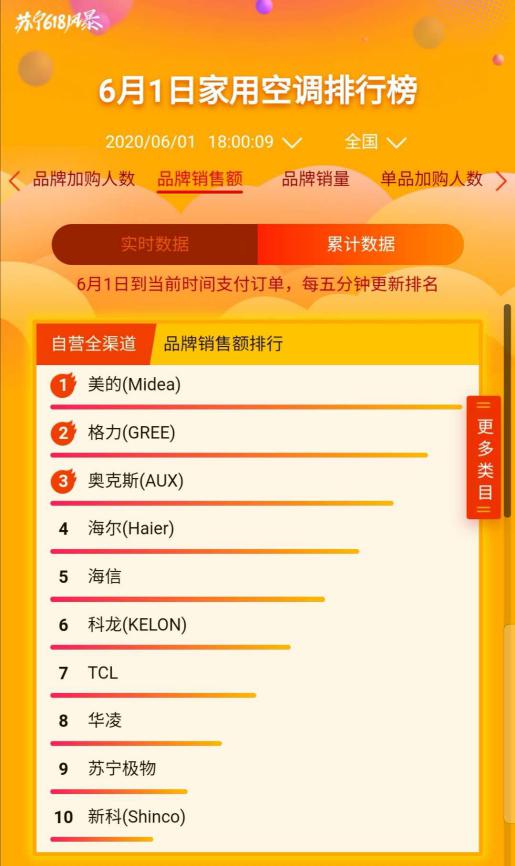 在蘇寧悟空榜,家電板塊火拼激烈,頭部品牌在蘇寧全渠道銷售暴增。截至6月1日18時(shí),美的摘得家用空調(diào)及中央集成全渠道銷售額冠王,同時(shí)橫跨多品類品牌TOP榜,成為最大贏家。
