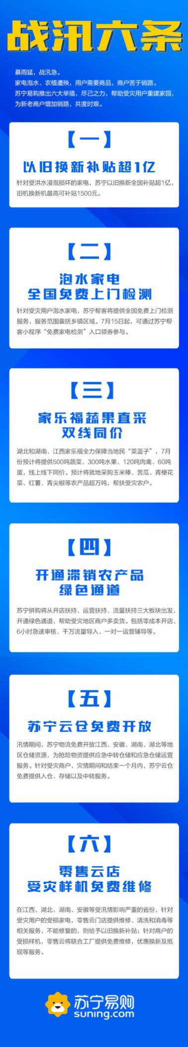 在江西、湖北、湖南、安徽等受汛情影響嚴(yán)重的省份,針對(duì)受災(zāi)用戶(hù)的受損家電,零售云門(mén)店也將提供維修、清洗和消毒,不能修復(fù)的,則給予以舊換新補(bǔ)貼。