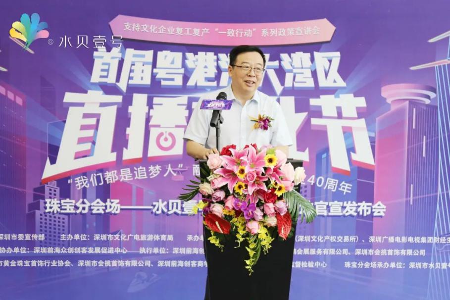 支持文化企業(yè)復(fù)工復(fù)產(chǎn)“一致行動”系列政策宣講會暨粵港澳大灣區(qū)直播文化節(jié)由中共深圳市委宣傳部指導(dǎo),深圳市文化廣電旅游體育局主辦,深圳市文化金融服務(wù)中心(深圳文化產(chǎn)權(quán)交易所)和深圳廣播電影電視集團(tuán)財經(jīng)生活頻道聯(lián)合承辦,深圳前海創(chuàng)客商學(xué)院有限公司、深圳市毅鵬會展服務(wù)有限公司和深圳市會挑首飾有限公司執(zhí)行舉辦。此次珠寶分會場活動由深圳市黃金珠寶首飾行業(yè)協(xié)會、深圳市會挑首飾有限公司、深圳前海創(chuàng)客商學(xué)院有限公司、國家首飾質(zhì)量監(jiān)督檢驗中心共同主辦,深圳市水貝壹號投資發(fā)展有限公司獨家承辦。