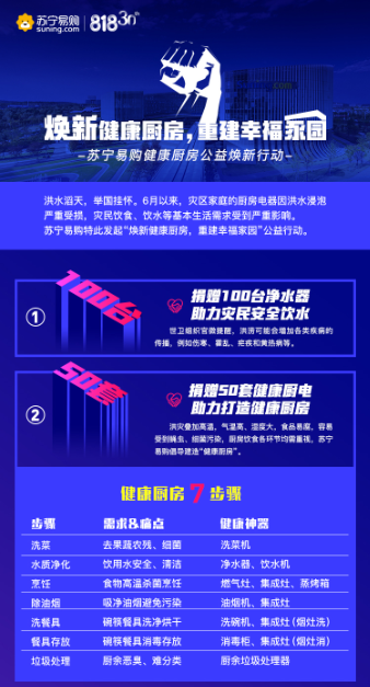 與此同時(shí),洪水致使大批廚房電器受損,疊加高溫天氣,災(zāi)民飲食安全面臨考驗(yàn)。蘇寧易購(gòu)特別捐贈(zèng)50套健康廚電,涵蓋油煙機(jī)、灶具、消毒柜等必備廚房電器,讓災(zāi)民更快恢復(fù)健康生活。同時(shí),廚房作為“病從口入”最關(guān)鍵的環(huán)節(jié),洗菜、水質(zhì)凈化、烹飪除油煙、餐具清潔消毒、廚余垃圾處理等每一環(huán)都不容忽視,蘇寧易購(gòu)特別倡導(dǎo)“健康廚房7步驟”,全流程打造健康廚房,并借助蘇寧易購(gòu)雙線渠道全面開展科普活動(dòng)。