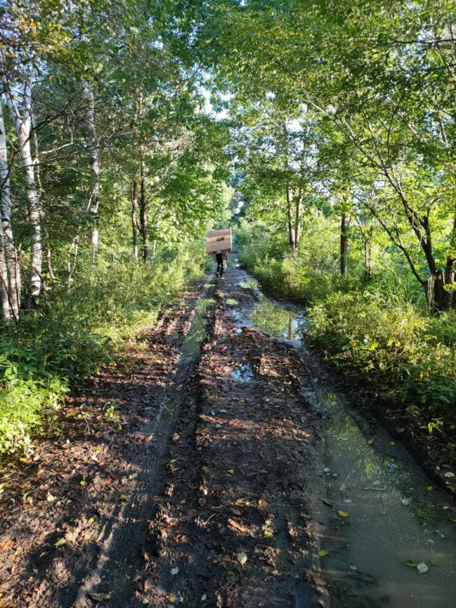 一路開下來(lái),車身濺起不少泥垢??斓侥康牡貢r(shí),一段泥濘的林間小路攔住了王能的去路。原來(lái),道路積水過(guò)多,泥土過(guò)軟,車輛不能前行。王能隨即將車??吭诼愤叄苯泳砩涎澩?,扛起電視前行。兩公里的林間路,本就不輕松,扛著電視更是“難上加難”。