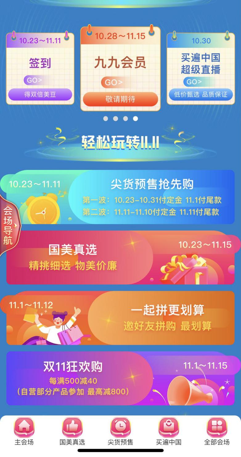 10月28日至11月25日,國美九九會(huì)員上線,只需九塊九,羊毛就能薅到手;10月30日,“買遍中國”直播杭州站開播,西湖美食便宜還好吃;11月1日-11月3日大促高峰啟動(dòng),各種紅包雨抽獎(jiǎng)嗨不停;11月4日至11月6日,萬人直播,空前視覺盛宴奉上;11月7日至11月10日,買遍歐洲直播活動(dòng),全球好物任你挑;后續(xù)還有返場(chǎng)福利等你來拿!