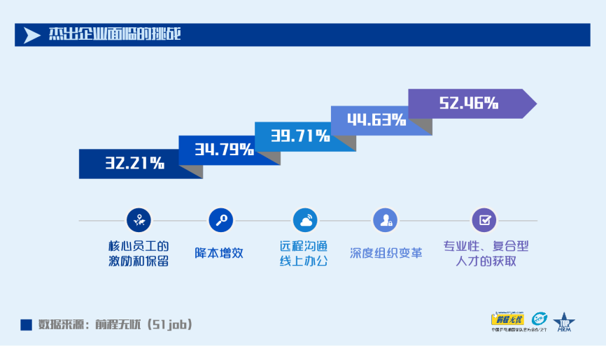 2020年杰出企業(yè)招聘員工總數(shù)較2019年增長(zhǎng)了4.21%;55.48%的企業(yè)預(yù)計(jì)人均招聘成本呈增長(zhǎng)趨勢(shì),在此前提下,依然有56.04%的企業(yè)預(yù)計(jì)會(huì)在2021年擴(kuò)大招聘來(lái)獲取人才優(yōu)勢(shì)。894家獲獎(jiǎng)企業(yè)中,有469家將“為籌備未來(lái)招募新團(tuán)隊(duì),加大專業(yè)性人才和復(fù)合型人才的獲取“列為本年度企業(yè)人力資源管理所面臨的最大的挑戰(zhàn)。