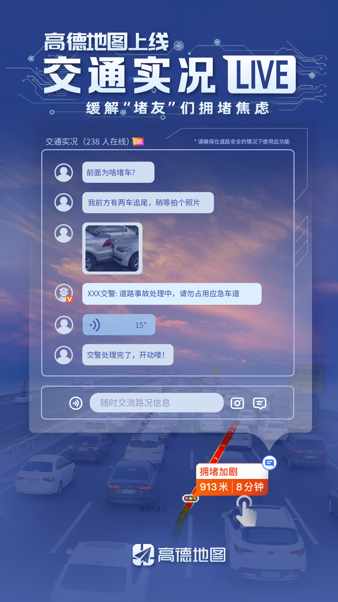 通過這個平臺,各地交管部門可及時發(fā)布擁堵事件的權(quán)威信息,如擁堵原因、派警情況、預(yù)計疏通用時及現(xiàn)場圖片等。當(dāng)用戶進(jìn)入嚴(yán)重?fù)矶侣范螘r,通過點擊提醒氣泡即可進(jìn)入該界面,實時了解擁堵信息。在車輛因堵車無法行進(jìn)時,“堵友”們還可以互通有無,通過文字、語音、圖片等多種方式,為后方司機(jī)分享第一手信息。而當(dāng)擁堵疏散時,“交通實況”功能也將自動關(guān)閉。