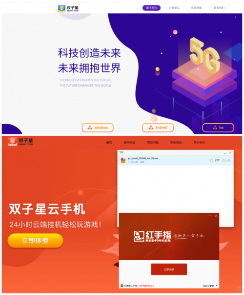 上圖為雙子星云手機官網(wǎng),下圖為紅手指仿照雙子星的官網(wǎng)