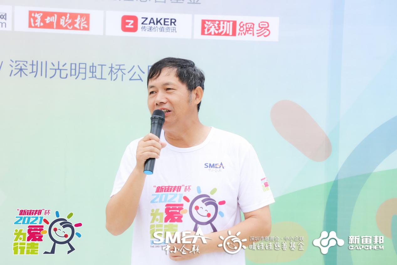 深圳中小企聯(lián)會(huì)長(zhǎng)、深圳市杰科電子有限公司董事長(zhǎng)黃榮添為開幕式致辭。他表示:“感謝新宙邦對(duì)本次慈善公益徒步活動(dòng)做出的貢獻(xiàn),以及今天參加此次活動(dòng)的愛心企業(yè)家、愛心人士們的大力支持,我代表深圳中小企聯(lián)感謝大家的參與,今后也希望通過各類活動(dòng)讓更多愛心人士關(guān)注我們“晴娃娃”,給更多的孩子送去關(guān)愛,能讓他們綻放開心的笑容?!?/p>