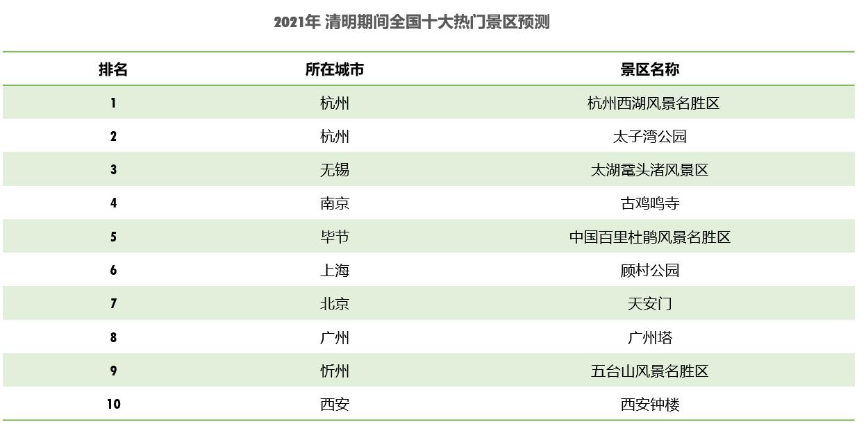 預(yù)計(jì)清明假期杭州西湖風(fēng)景名勝區(qū)最為熱門,其次為太子灣公園、太湖黿頭渚風(fēng)景區(qū)、古雞鳴寺、中國(guó)百里杜鵑風(fēng)景名勝區(qū)、顧村公園、天安門、廣州塔、五臺(tái)山風(fēng)景名勝區(qū)、西安鐘樓。