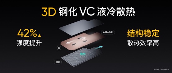真我GT的性能表現(xiàn),離不開優(yōu)秀散熱技術(shù)的強力支持,創(chuàng)新的3D鋼化液冷散熱不乏好評。作為GT系列戰(zhàn)略成員,真我GT Neo繼承了GT系列的強悍基因,同樣搭載3D鋼化VC液冷散熱。創(chuàng)新的3D鋼化VC液冷散熱不僅大幅度提高了均熱板的強度,同時內(nèi)部的結(jié)構(gòu)優(yōu)化也讓整體的散熱效率進一步提升。配合100%覆蓋核心發(fā)熱源的多重立體散熱系統(tǒng),高性能的同時保持冷靜。