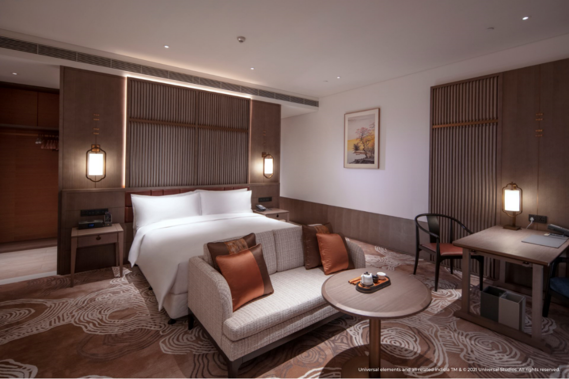 酒店設(shè)計以當(dāng)代視角詮釋中國傳統(tǒng)文化及人文歷史底蘊,兼具現(xiàn)代便捷與奢華典雅。與此同時,400間寬敞雅致的客房設(shè)計也融入了中國古典皇家園林的精巧設(shè)計,以天然材料刻畫自然之美。作為品牌標志性的元素之一,所有客房均配備有煮茶套裝,賓客可以在驚險刺激的主題游園體驗之后享受輕松愉悅的茗茶時光;此外,位于酒店大堂吧的專屬茶室還將提供專業(yè)的互動品茗體驗。