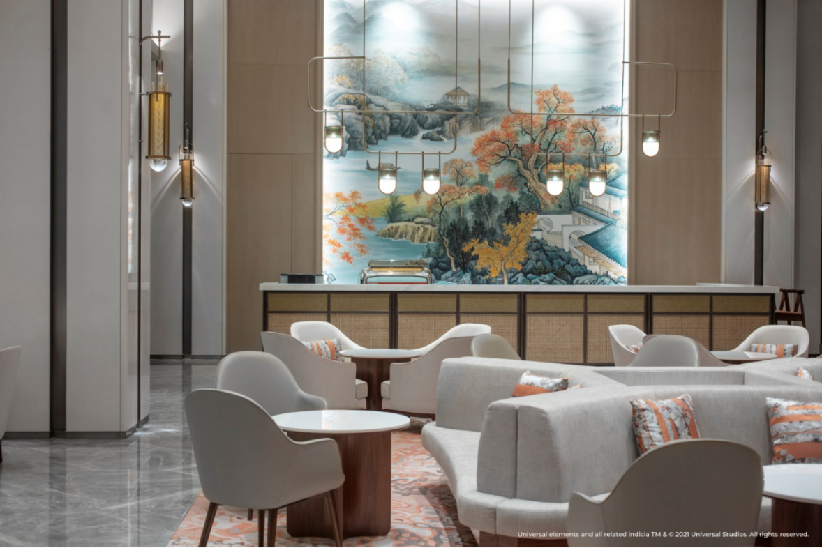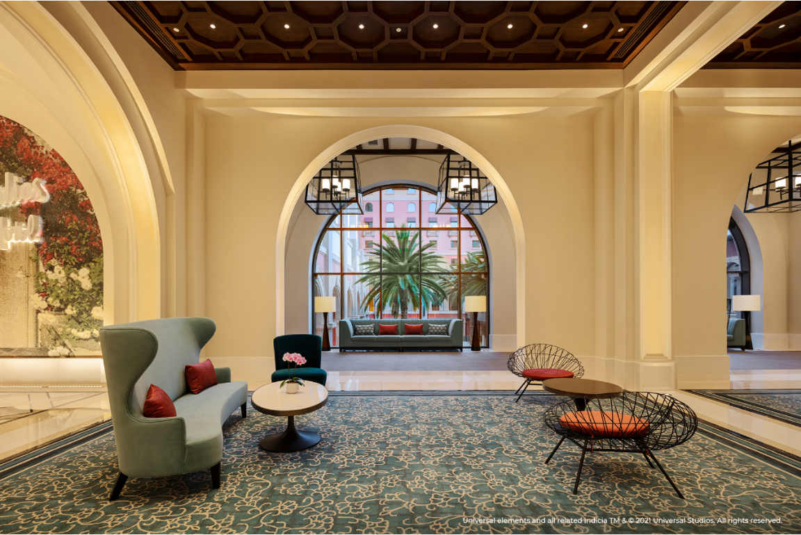 環(huán)球影城大酒店位于北京環(huán)球影城主題公園入口,入住賓客將可以俯瞰園區(qū)的絕佳景觀。作為全球首家以環(huán)球品牌命名的主題酒店,環(huán)球影城大酒店在設(shè)計中融入了極具加州特色的西班牙復(fù)興風(fēng)格,巧妙再現(xiàn)好萊塢電影黃金時代的輝煌與風(fēng)華,同時結(jié)合了中性色調(diào)的現(xiàn)代演繹以及繽紛色彩點綴。酒店大堂內(nèi)西班牙風(fēng)格的噴泉和玻璃馬賽克三角梅花墻帶來輕快靈動的熱帶海岸氣息,定制的橙花調(diào)香氛則令人仿佛置身加州,讓賓客感受到典雅而充滿活力的度假氛圍。酒店公共區(qū)域內(nèi)的珍貴電影海報將帶領(lǐng)賓客探尋動人心扉的光影世界背后,精彩絕倫卻不為人知的創(chuàng)作瞬間。從復(fù)古經(jīng)典系列,到現(xiàn)代電影杰作,更有大量的幕后花絮呈現(xiàn)一段歷久彌新的電影之旅,回溯環(huán)球超過一個世紀的電影歷史的光輝歷程,致敬品牌在光影史上的耕耘與貢獻。