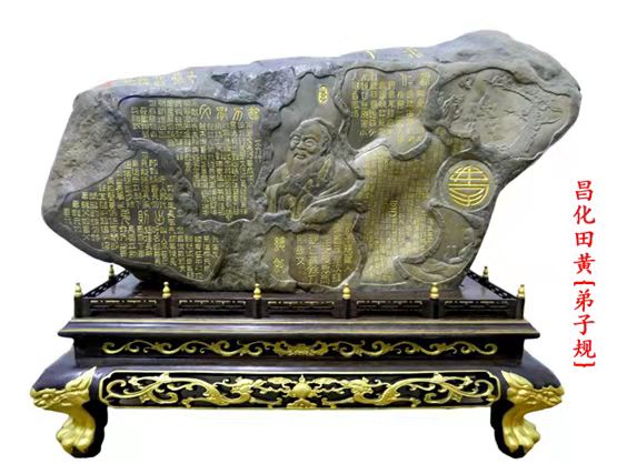 現(xiàn)場所見,該展位展出的一排田黃石中,有兩塊雞血石雕件是錢高潮帶過來的。錢高潮是第二批國家級非物質(zhì)文化遺產(chǎn)項目石雕 (雞血石雕 )代表性傳承人、中國工藝美術(shù)大師、G20杭州峰會國禮設(shè)計制作者。另有一件作品是工藝美術(shù)師鄭先軍雕刻的昌化黑田《弟子規(guī)》,恩師錢高潮親手操刀題跋:“學無止境,寸草春暉”,激勵學生刻苦勤勉,牢記師傅“一生擇一事”,為了昌化石雕事業(yè),幾十年如一日的刻苦精神。