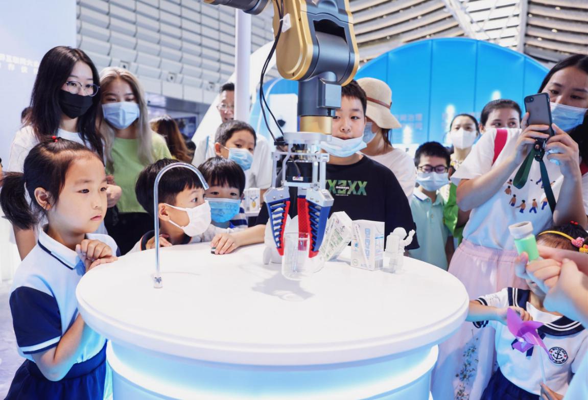 這牛奶和其他的不太一樣,很香濃。“離心精萃‘白科技’開啟臻濃新紀(jì)元”展臺一直就是博覽會現(xiàn)場的“人氣王”,這里以宇宙探索為主題,科幻感十足,火箭發(fā)動機(jī)噴出淡淡煙霧,三臺智能機(jī)械臂不停忙碌,人們排起長隊,品嘗由“離心精萃科技”現(xiàn)場調(diào)制的伊利臻濃牛奶。在這里,吸引觀眾的不僅是美味的伊利牛奶,也有滿滿的數(shù)字科技。