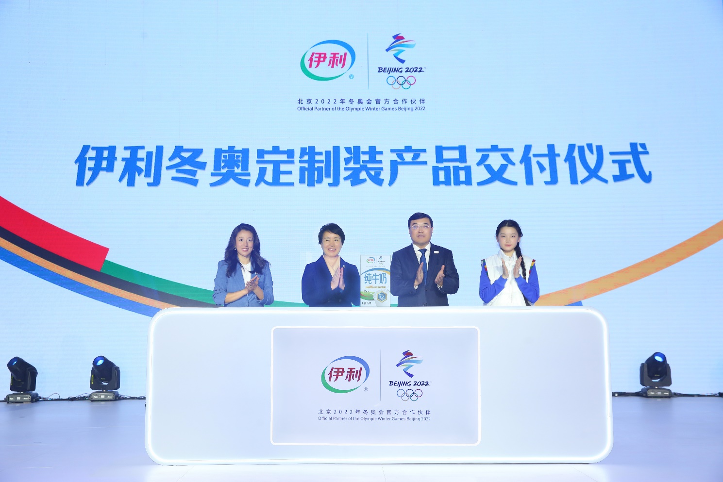 從左到右依次是:北京冬奧組委運動員委員會主席楊揚,北京冬奧組委專職副主席、秘書長韓子榮,伊利集團董事長、總裁潘剛,伊利冬奧志愿團形象大使