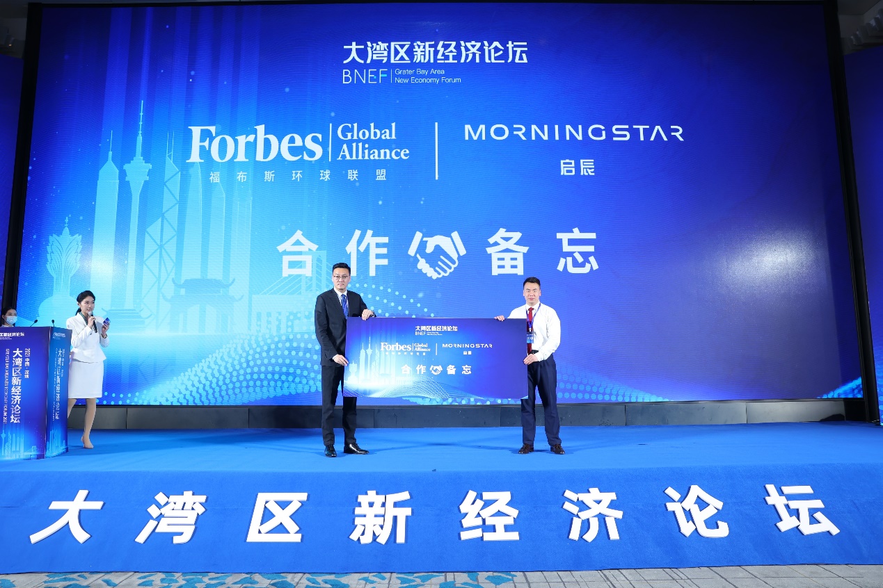論壇現(xiàn)場啟動福布斯環(huán)球聯(lián)盟和新經(jīng)濟論壇合作備忘儀式,大灣區(qū)新經(jīng)濟論壇發(fā)起人馬曉晨和福布斯環(huán)球聯(lián)盟會員發(fā)展部總監(jiān)郭雋祎Michael上臺攜手展示合作備忘,未來合作雙方將提攜并進,共同發(fā)展。