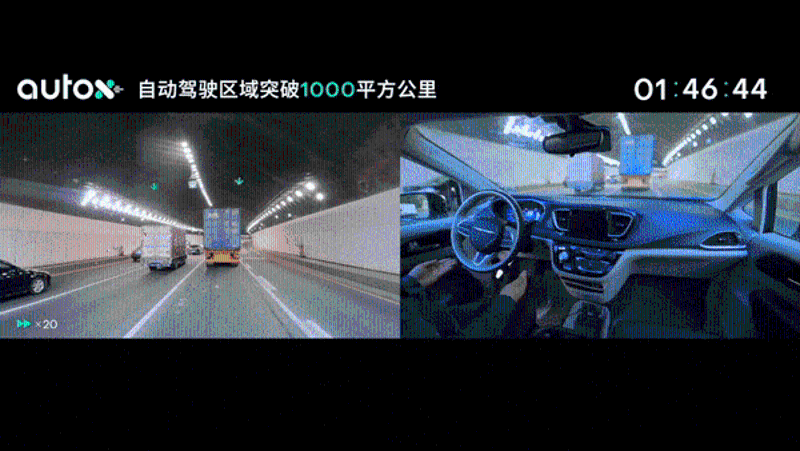 此外,無(wú)人車還穿越了長(zhǎng)達(dá)2.3公里隧道。在1小時(shí)46秒進(jìn)入隧道后,AutoX無(wú)人車始終保持50-60公里高速時(shí)速,連續(xù)穿越三個(gè)隧道,最終平穩(wěn)駛出,定位算法輕松應(yīng)對(duì)數(shù)公里長(zhǎng)的隧道。