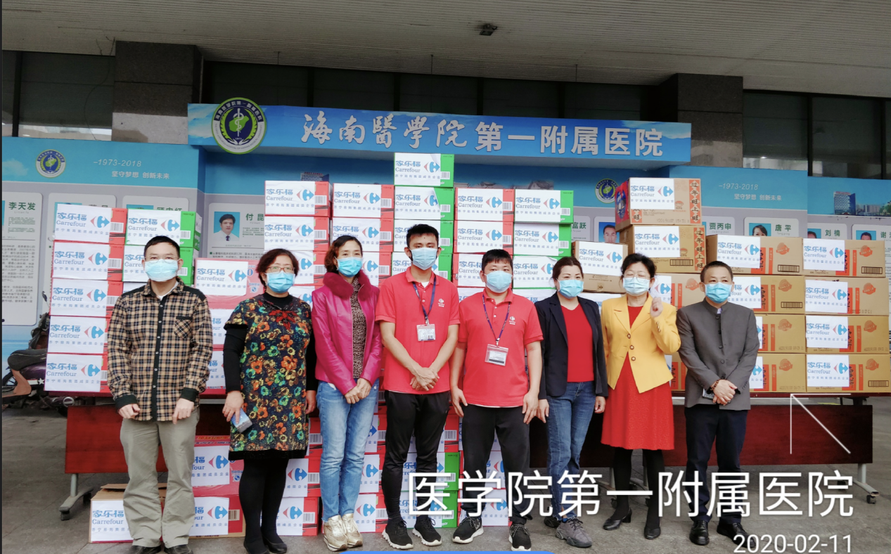 海口蘇寧家樂福于2月11日上午,向海南醫(yī)學(xué)院第一附屬醫(yī)院捐贈了一批生活方便食品,涵蓋速食面、牛奶、八寶粥、功能飲料等。