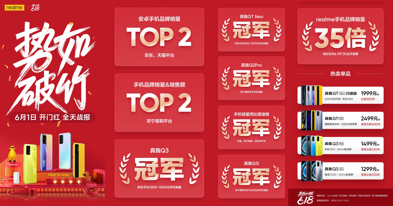 智能手機(jī)品牌realme真我公布618開門紅首日戰(zhàn)報(bào):realme真我斬獲京東、天貓平臺(tái)安卓手機(jī)品牌銷量TOP2,蘇寧易購手機(jī)品牌銷量&銷售額TOP2,成為天貓、蘇寧易購、拼多多平臺(tái)手機(jī)銷量同比增速榜冠軍,手機(jī)品牌銷量超過去年開門紅全天銷量35倍,創(chuàng)下品牌618開門紅歷史最佳成績(jī)!