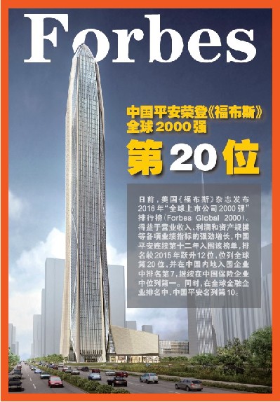 美國《福布斯》雜志26日發(fā)布了2016年“全球上市公司2000強(qiáng)”排行榜(Forbes Global 2000)。得益于營業(yè)收入、利潤和資產(chǎn)規(guī)模等各項(xiàng)業(yè)績指標(biāo)的強(qiáng)勁增長,中國平安保險(xiǎn)(集團(tuán))股份有限公司(以下簡稱“中國平安” 或“平安”,股票代號:香港證券交易所2318,上海證券交易所601318)連續(xù)第十二年入圍該榜單,排名較2015年躍升12位,位列全球第20位,并在中國內(nèi)地入圍企業(yè)中排名第7,繼續(xù)在中國保險(xiǎn)企業(yè)中位列第一。同時,在全球金融企業(yè)排名中,中國平安名列第10。
