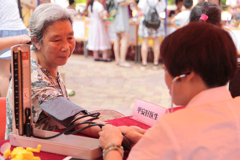義診現(xiàn)場,居民們排隊(duì)等候醫(yī)護(hù)人員幫他們做檢查?!扒皟商欤吹胶?bào)上說今天的活動(dòng)有義診,這不,剛帶孫子游泳回來就過來了?!本用駝⒛棠虖陌锬贸隽艘粋€(gè)裝藥品的塑料袋,告訴記者,自己高血壓,想讓醫(yī)生瞧瞧那些藥還要不要吃。