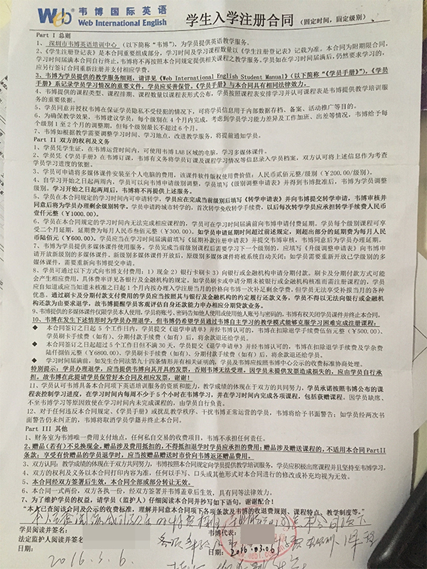 6節(jié)課,花費34800元 投訴深圳市韋博國際英語培訓(xùn)中心單方合同條款,忽視消費者權(quán)益。