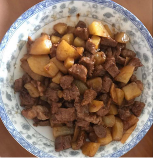 我們準(zhǔn)備好食材:梅頭肉、土豆、生抽和老抽、姜、少量白砂糖和油。媽媽把梅頭肉在水里煮了一下。這個(gè)時(shí)候,我也沒(méi)閑著,我拿出幾個(gè)土豆,洗好,再用刨子小心翼翼地把皮削干凈。我和媽媽一起把梅頭肉和土豆切塊,把姜切細(xì),就準(zhǔn)備下鍋了。媽媽先倒一點(diǎn)油到鍋里,鍋熱后把姜放進(jìn)去。接下來(lái)是切好的梅頭肉,將肉燒的泛黃后倒入土豆,然后是生抽和老抽各一小勺,還要放入少量的白砂糖,最后用水剛好沒(méi)過(guò)食材。先大火后中火再轉(zhuǎn)小火燜大約三十分鐘,收汁,出鍋!