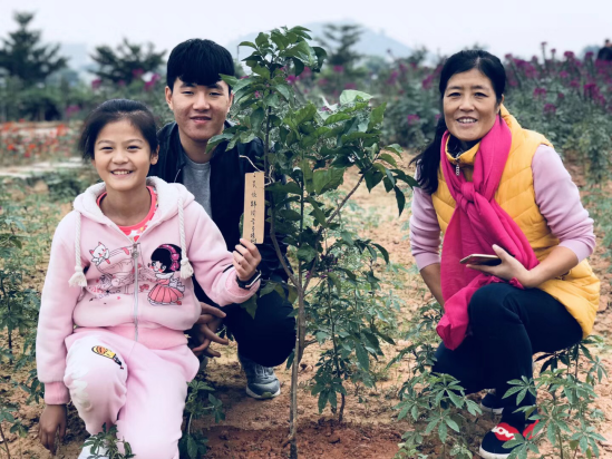 和自己栽植黃皮樹合影