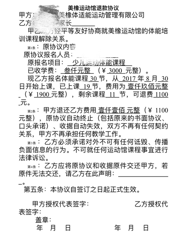 我于2017年8月30日續(xù)報深圳市美橡體適能運(yùn)動管理有限公司體能課程,已經(jīng)是第三次報了,每次3000元,30節(jié)課,都是與教練微信溝通與轉(zhuǎn)帳。2018年1月10日收到該公司通知說結(jié)束體能館的業(yè)務(wù),不再營業(yè),說統(tǒng)一給我們退剩余的課程費(fèi)用,12號加了該公司財務(wù)微信溝通相關(guān)退費(fèi)事宜,財務(wù)說統(tǒng)計好在一周內(nèi)統(tǒng)一給我們退費(fèi),19號收到財務(wù)信息,說可以退回1100元,還說幾天后可以退款,并說好通過微信退還(當(dāng)時壓根沒有說簽協(xié)議后再退),一周拖一周,在23號忽然發(fā)微信來通知說要求去簽協(xié)議才退款,當(dāng)天又進(jìn)行了協(xié)商,因為我?guī)z小孩實在抽不出時間去他們公司,能否把協(xié)議發(fā)到我郵箱確認(rèn),財務(wù)說先與他老板匯報后第二天給回復(fù),但第二天也沒有收到任何回復(fù),然后又問財務(wù)協(xié)議發(fā)過來了嗎?財務(wù)二話沒說就把協(xié)議通過微信發(fā)給我,當(dāng)時想想簽了就算了,但細(xì)看第三、四條真的很難讓人接受,內(nèi)容詳見附件1。我們交費(fèi)的時候什么協(xié)議、收據(jù)對方都沒給,現(xiàn)在退錢就要求我們簽協(xié)議,而且是霸王條款,還叫我寫上“我自愿終止培訓(xùn)課程”,老天哪是我自愿的,真是有種迫良為猖的感覺,還有第三條,也太污辱人格了,再次和他們友好協(xié)商希望把協(xié)議第三條改了,對方視而不見,不理不睬,也不積極回應(yīng)。