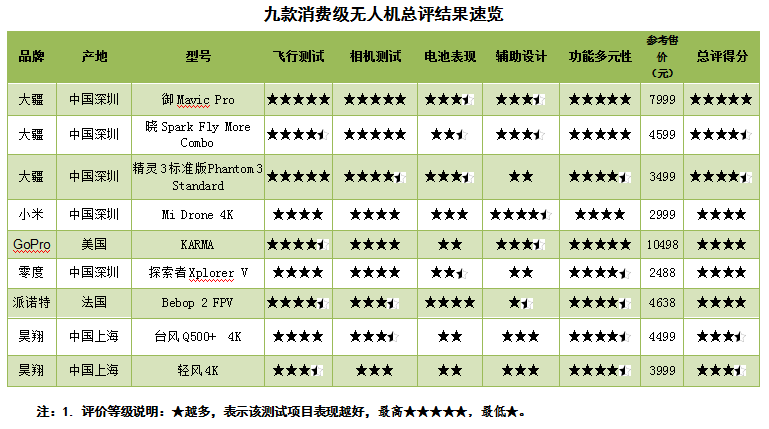 其中大疆的“御Mavic Pro”和“曉Spark Fly More Combo”表現(xiàn)出眾,獲得5分滿分。