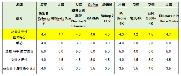 整體得分最佳為GoPro“KARMA”,獲4.8分;其次是大疆的“御Mavic Pro”和“曉Spark Fly More Combo”,獲4.7分。詳見下表。