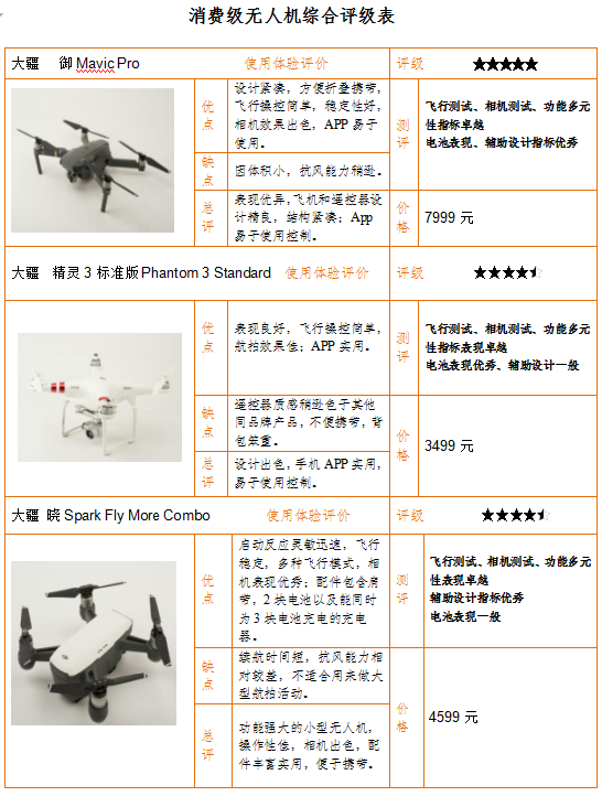 御Mavic Pro”和“精靈3標(biāo)準(zhǔn)版Phantom 3 Standard”,充電時間較短,續(xù)航時間較長,表現(xiàn)較好,獲評3.5分。