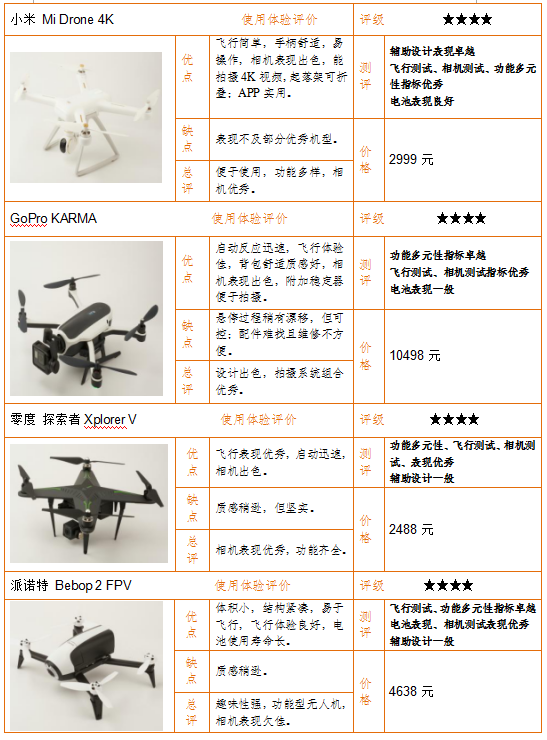 總評:小米“Mi Drone 4K”輔助設(shè)計表現(xiàn)最好,獲評4.5分。派諾特“Bebop 2 FPV”和零度“探索者Xplorer V”表現(xiàn)較差,僅獲評1.3分和1.8分。詳見下表。