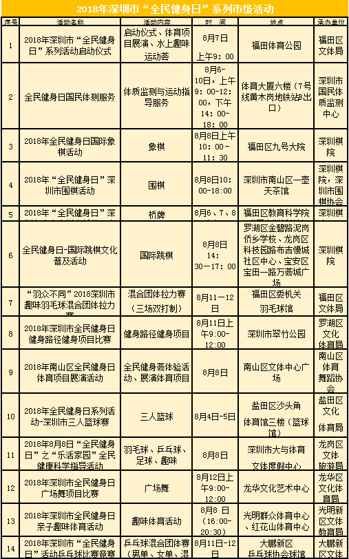 ????為方便更多群眾加入全民健身隊(duì)列,在今年的“全民健身日”,深圳市文體旅游局將在8月4日至12日,在全市開展全民組織開展,其中市級(jí)活動(dòng)14項(xiàng),各區(qū)也將因地制宜對活動(dòng)進(jìn)行時(shí)空拓展。下表為14大市級(jí)活動(dòng)詳情。