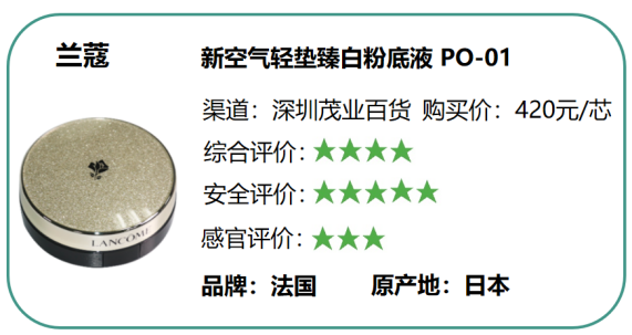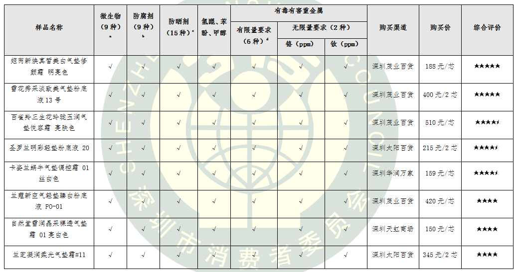 (一)8款氣墊粉底所測項(xiàng)目包括微生物、重金屬、防腐劑和化學(xué)防曬劑等44項(xiàng)指標(biāo),不僅符合國家標(biāo)準(zhǔn)要求,且符合歐盟(包含德國)、美國和日本的標(biāo)準(zhǔn)要求,品質(zhì)安全性達(dá)到國際一流標(biāo)準(zhǔn)。