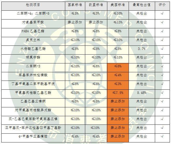 防曬化妝品在美國按非處方藥(OTC)管理,新的防曬劑當(dāng)作新藥品來批準(zhǔn),審評要求非常嚴(yán)格。本次比較試驗(yàn)測試的15類化學(xué)防曬劑按照國標(biāo)、歐標(biāo)和美標(biāo)中最嚴(yán)格的標(biāo)準(zhǔn)進(jìn)行評價(jià)。我國允許使用的5類化學(xué)防曬劑在美國被禁止使用,還有4類化學(xué)防曬劑在美國的限量要求更加嚴(yán)格。
