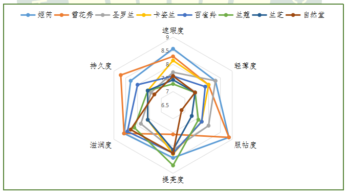 獲得本次感官評價(jià)指標(biāo)綜合得分前三名的品牌為:姬芮、雪花秀和圣羅蘭,得分分別為:8.44、8.22和7.91。8款產(chǎn)品在感官評價(jià)中均達(dá)到優(yōu)良水平以上。