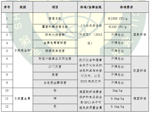 本次比較試驗(yàn)檢測項(xiàng)目廣泛征求了企業(yè)、業(yè)內(nèi)專家和第三方檢測機(jī)構(gòu)的意見,不僅依據(jù)了現(xiàn)行國家標(biāo)準(zhǔn),而且在國標(biāo)基礎(chǔ)上結(jié)合嚴(yán)格的歐盟標(biāo)準(zhǔn) 《歐盟化妝品法規(guī)EC1223/2009及其相關(guān)修訂文件》、《歐盟消費(fèi)者安全科學(xué)委員會(SCCS)關(guān)于化妝品安全的第九版指南》、德國聯(lián)邦消費(fèi)者保護(hù)和食品安全局(BVL)關(guān)于可避免雜質(zhì)重金屬限值的調(diào)查報(bào)告、美國《聯(lián)邦食品、藥品和化妝品法案》、日本厚生勞動省《藥事法》以及其它相關(guān)標(biāo)準(zhǔn)、法規(guī)和技術(shù)文件的要求,采用國家標(biāo)準(zhǔn)檢測方法、實(shí)驗(yàn)室通用方法等手段進(jìn)行檢測,從44項(xiàng)指標(biāo)展開氣墊粉底安全性品質(zhì)大比拼,詳細(xì)項(xiàng)目與要求見表1。