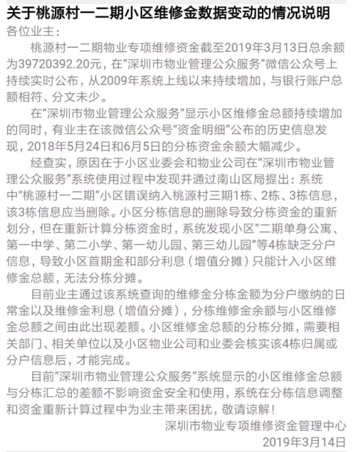 3月18日,南山區(qū)住房和建設(shè)局通過深圳論壇進行公開回應(yīng),稱經(jīng)向市物業(yè)專項維修資金管理中心查詢,原因在于桃源村三期1棟、2棟、3棟信息刪除及分棟資金的重新劃分,以致小區(qū)首期維修金和部分利息(增長分攤)只能計入小區(qū)維修金總額,無法分棟分攤。