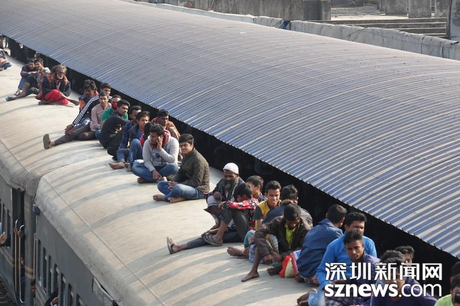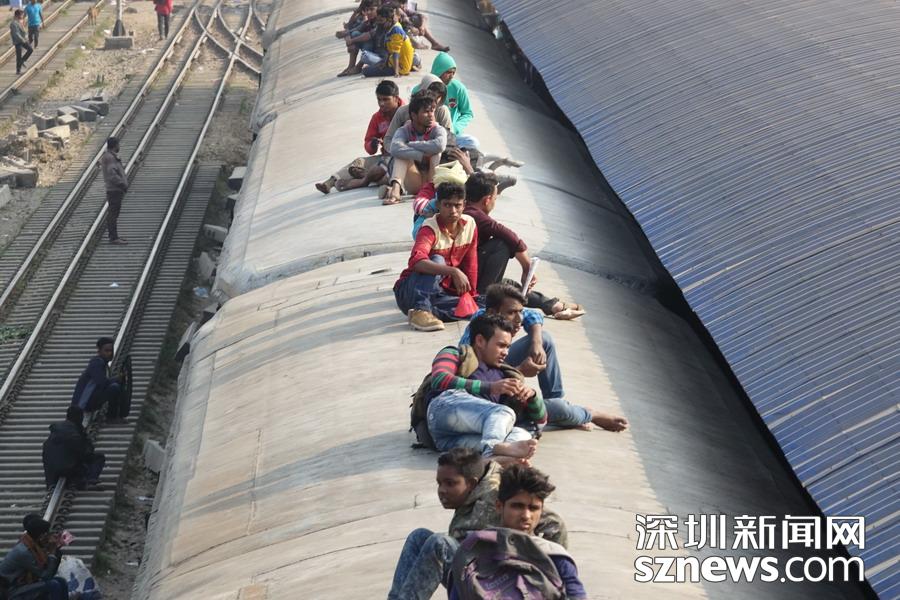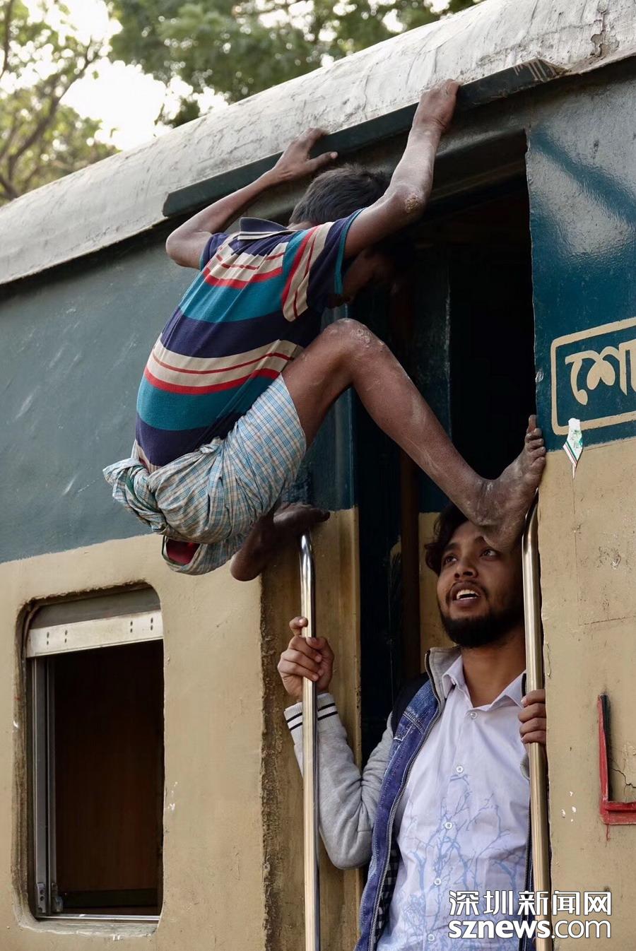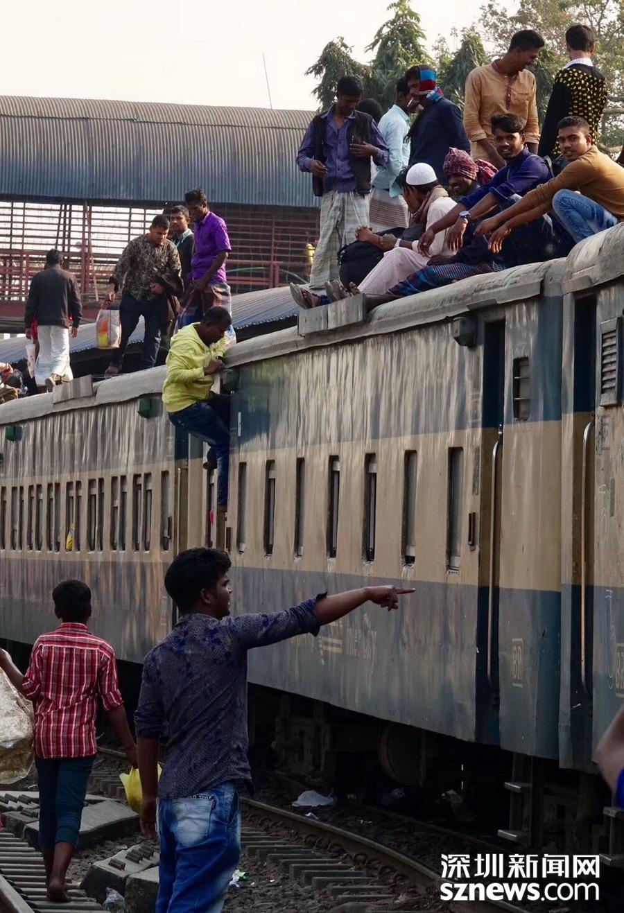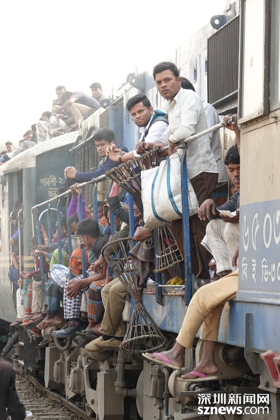 從達(dá)卡到邁門辛的火車是國內(nèi)最擁擠的線路之一,通常有數(shù)千名旅客擠在載客人數(shù)只有650人的火車?yán)铮械淖ブ咽?,有的蹲在門口,要不就蹲在車箱間的聯(lián)軸上或坐在車頂上。李仁奇攝
